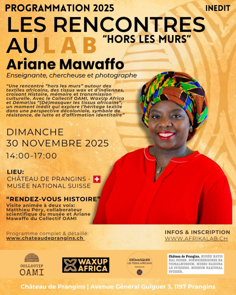 Le 30 novembre 2025, dans le cadre de la Journée internationale pour l’abolition de l’esclavage, le Château de Prangins accueille une rencontre sensible et immersive autour de l’histoire et de la symbolique des textiles, menée par Ariane Mawaffo. Photographe, enseignante et chercheuse genevoise d’origine camerounaise, elle explore les tissus africains comme espaces de mémoire, d’identité et de transmission culturelle.